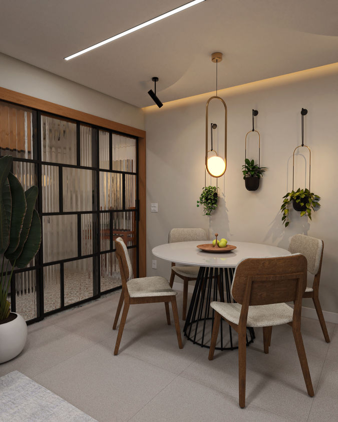 Buscando um ambiente confortável para um casal sem filhos, criamos um espaço contemporâneo que dialogue com a estética vintage, utilizando o vidro canelado como elemento chave para delimitar ambientes, criar jogos de luz e sombra e criar vínculo entre toda as partes da moradia. Pensando na proposta, desenvolvemos uma paleta de cores suave e harmoniosa com tons neutros e toques de cores vibrantes como o azul e o amarelo. As cores foram selecionadas para transmitir calma e alegria respectivamente, criando ambientes variados que refletem a personalidade do casal. A iluminação foi cuidadosamente planejada para realçar a textura do piso hidráulico, os materiais naturais estratégicos e a luminosidade do vidro canelado, criando uma atmosfera aconchegante e convidativa. Buscamos um design contemporâneo equilibrado com elementos vintage, móveis funcionais e elementos decorativos que refletem a essência do casal.